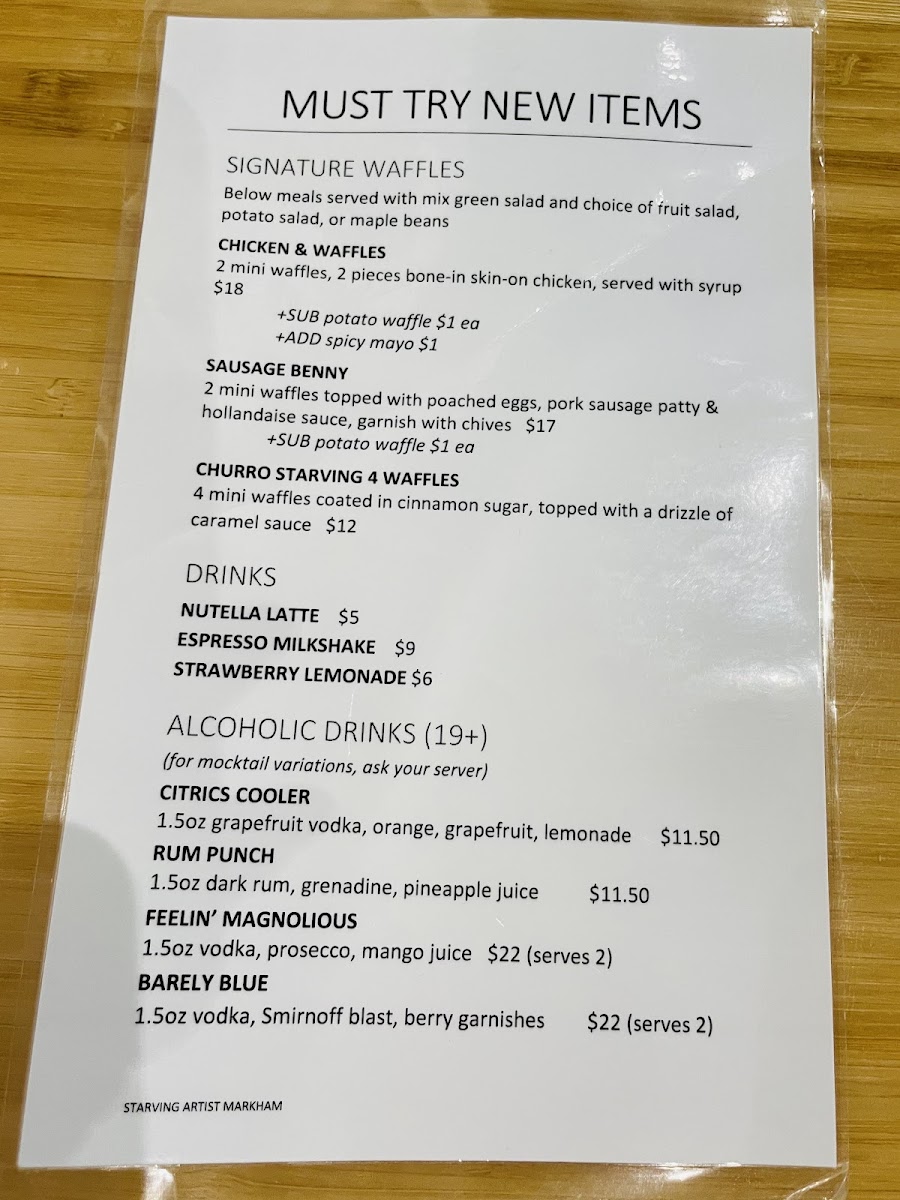 Welcome to Starving Artist Waffles & Espresso, a delightful culinary haven nestled at 5762 Hwy 7 Unit 3, Markham, ON. This whimsical spot offers a menu that celebrates the art of waffles, featuring both gluten-free and vegan options. The Signature Waffles truly shine, with highlights like the Gluten Free Starving 4 Waffles topped with fresh sides, and the indulgent French Toast made from cinnamon raisin waffles.